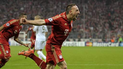 Riesenjubel bei Franck Ribéry! Auf dem Weg ins „Finale dahoam“ traf der Franzose im Halbfinal-Hinspiel (14.4.2012) zur 1:0-Führung gegen Real Madrid. Am Ende feierten die Bayern einen 2:1-Sieg dank eines Last-Minute-Treffers von Mario Gomez. - Zeige in voller Größe