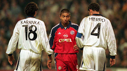 Giovane Elber ist bester Laune - und das ohne eigenen Torerfolg. Der brasilianische Bayern-Stürmer freute sich am 29. Februar 2000 über einen 4:2-Sieg in Madrid in der Zwischenrunde. Mehmet Scholl, Stefan Effenberg, Thorsten Fink und Paulo Sergio trafen im Bernabéu und sorgten für die bis heute höchste CL-Heimniederlage der „Königlichen“. - Zeige in voller Größe