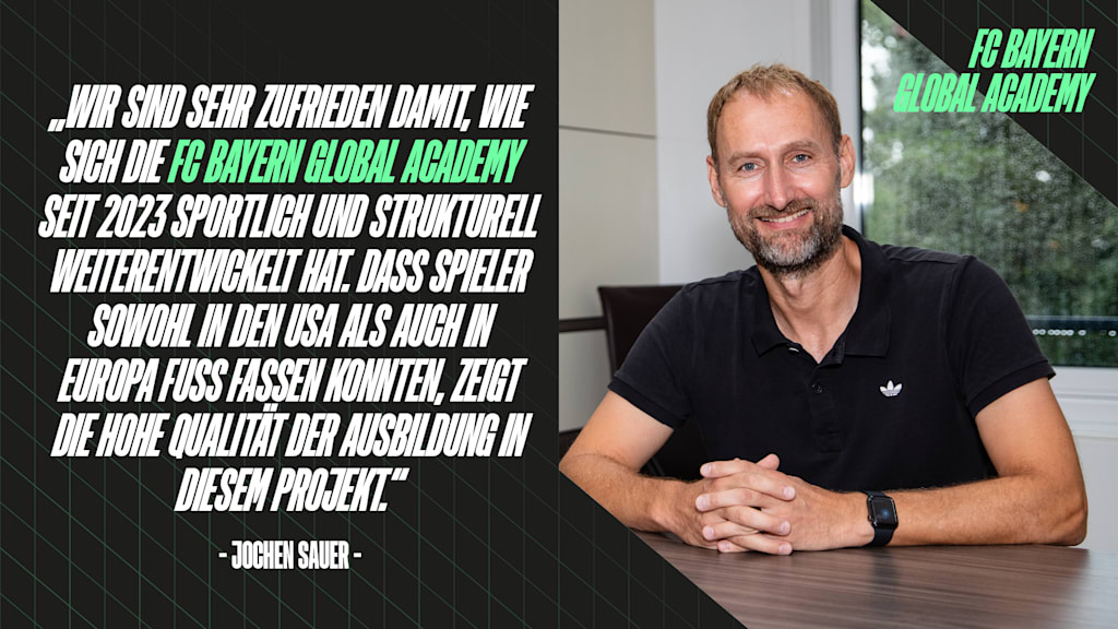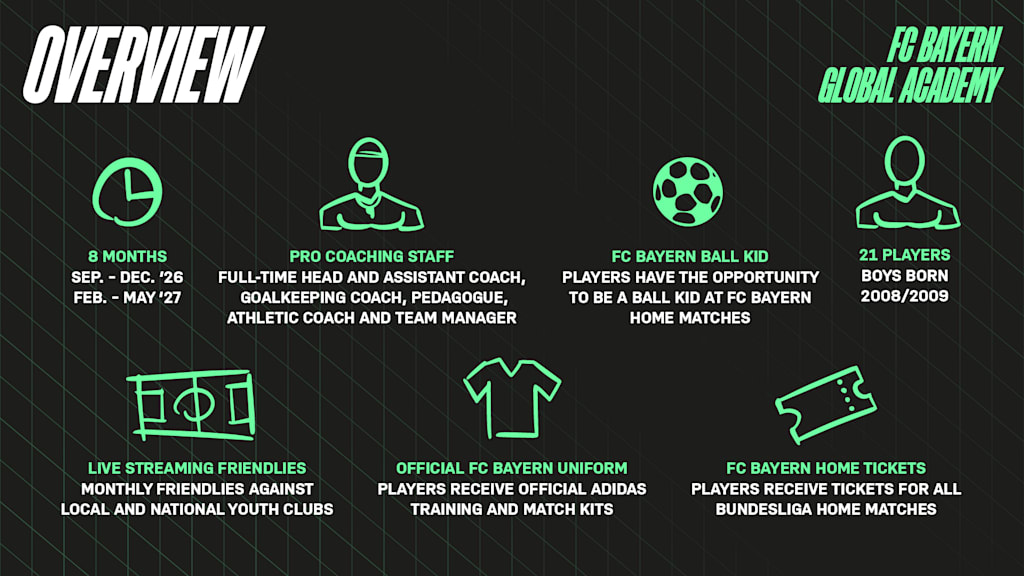 Seit September 2023 bietet der FC Bayern U18-Spielern weltweit die einzigartige Möglichkeit, sich unter professionellen Bedingungen eine ganze Saison lang am renommierten FC Bayern Campus, dem Nachwuchsleistungszentrum des Rekordmeisters, weiterzuentwickeln. Die FC Bayern Global Academy bietet damit eine einzigartige Plattform für talentierte Spieler außerhalb Deutschlands, ihren Traum vom Profifußball unter Aufsicht des hoch qualifizierten Trainerteams entscheidend voranzutreiben. Neben dem täglichen Training, der schulischen Ausbildung und dem kulturellen Austausch, sorgen die wöchentlichen Spiele gegen regionale und nationale Mannschaften für die nötige Wettkampfhärte.