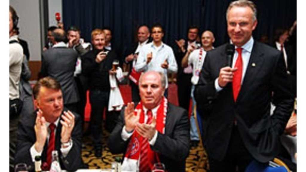 Ich kann der Mannschaft nur eines sagen: Wir alle beim FC Bayern, egal ob Uli Hoeneß, Karl Hopfner, Franz Beckenbauer, das gesamte Präsidium mit Bernd Rauch und Fritz Scherer, wir alle sind sehr stolz, Mitglied dieser Familie zu sein und diesen Abend heute mit Euch feiern zu dürfen - leider viel zu kurz, weil wir uns schon wieder auf das Spiel am Samstag vorbereiten müssen. Das ist das Einzige, was ich heute an Wasser in den Wein kippen muss, lieber Louis. Aber Du bis ja der Erste und hast schon in der Kabine gesagt: Bitte an Samstag denken.