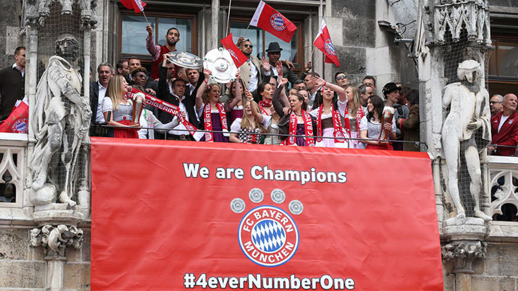 Unter dem Motto „We are Champions - #4everNumberOne“ waren die beiden Meisterteams der Einladung von Oberbürgermeister Dieter Reiter gefolgt, um ihren Fans die beiden Meisterschalen zu präsentieren. Nach einer kurzen Nacht und der internen Feier im Postpalast traten die zwei Titelträger um 14:37 Uhr gemeinsam auf den Balkon.