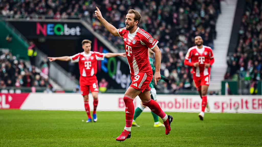 Harry Kane streckt die Hand jubelnd in die Luft während des Bundesliga-Gastspiels des FC Bayern beim SV Werder Bremen | © FC Bayern