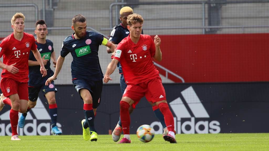Es entwickelte sich eine rassige Partie auf gutem Niveau. Den ersten Abschluss hatten die Bayern bereits nach zwei Minuten. Günther zog mit Tempo aus dem rechten Halbfeld ins Zentrum und hielt aus 18 Metern drauf. Sein Schuss war jedoch zu zentral, so dass FSV-Schlussmann Lasse Finn Rieß abwehren konnte. Die beste Gelegenheit in Durchgang eins hatte der FCB in Minute 21. Angelo Stiller zog nach einer Ecke aus halblinker Position ab, Rieß lenkte den Ball mit einem starken Reflex über die Latte. Die Münchner hatten mehr Spielanteile, Mainz stand defensiv aber sehr kompakt und ließ nur wenig zu. Es ging torlos in die Halbzeit.