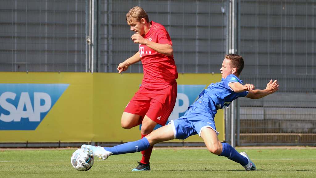 Die Bayern-Junioren erwischten den besseren Start und verzeichneten durch Moritz Mosandl und Batista Meier die ersten Abschlüsse. Im Anschluss entwickelte sich ein ausgeglichenes Spiel in dem auch Hoffenheim eine gute Spielanlage und teilweise gefährliche Aktionen Richtung Bayern-Tor zeigte. Die besseren Chancen hatten jedoch die Gäste, wie in der 16. Minute, als Mosandl an Torwart Daniel Klein scheiterte. Kurz darauf machten es die Münchner besser. Nach einem tollen Spielzug über Malik Tillman, legte Batista Meier quer und Günther (19.) drosch den Ball zum verdienten 1:0 in die Maschen. Drei Minuten später hatte dann der Vorbereiter des Führungstreffers das 2:0 auf dem Fuß, scheiterte aber an Torhüter Klein. In der 33. Spielminute hatten die Bayern das Glück auf ihrer Seite, als ein Schuss der Hoffenheimer nur an der Latte landete. Bis zur Halbzeit gestaltete sich die Partie ähnlich wie in den ersten 20 Minuten mit Möglichkeiten auf beiden Seiten, aber einem Chancenplus für die Münchner.