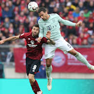 The 50,000 full house in Nuremberg saw Bayern dominate proceedings but struggle to create chances against the deep-lying hosts. Netminder Christian Mathenia beat Lewandowski to a Müller pass. Lewandowski was soon upended 25 yards out, Alaba stepping up to take the free-kick, but Mathenia made a strong save to direct the ball onto the crossbar.