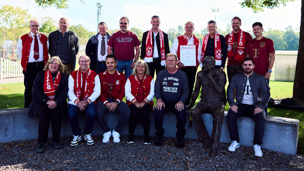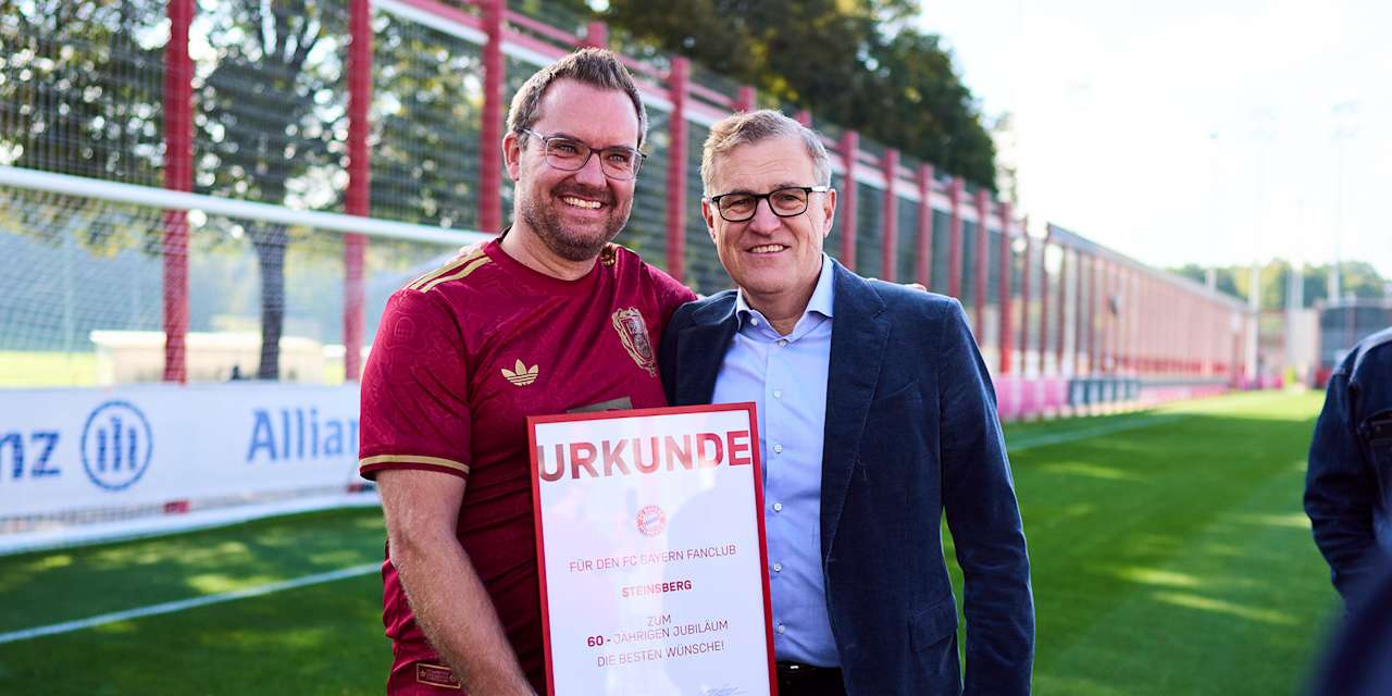 Dreesen personally helped out when the glasses were handed out, and souvenir photos were taken on the hallowed turf of the training ground and at the Kurt Landauer statue. Some of the members arrived dressed in traditional Bavarian outfits, in the 125th anniversary kit or in the current Oktoberfest jersey. “Our fans and members are the foundation on which everything at FC Bayern stands,” said Hainer. “Sixty years speaks for itself. Our club can build on the Steinsberg foundation with complete confidence.” Josef Rewitzer, representing the board, accepted the anniversary certificate from Dreesen on behalf of Ewald Reißer, one of the three surviving founding members, along with a jersey signed by the entire team.