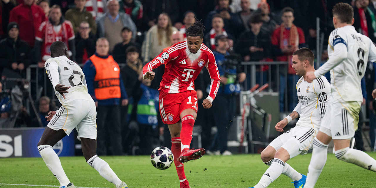 The scoreboard is showing 90'+4. The final seconds are ticking away, the score is 3-3, Real are pressing, Bayern are defending with everything they've got. Then they break free from the pressure one last time in a controlled manner, link up through the centre and the ball ends up with Kane. The Englishman looks up and shifts play to the right - to where Olise is waiting.