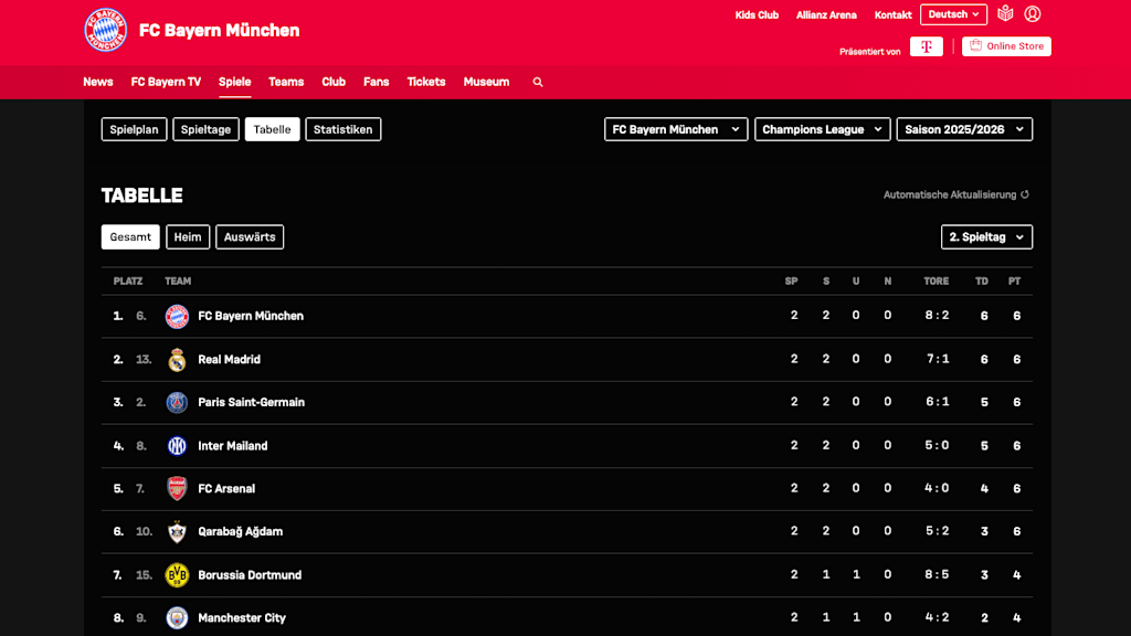 Bayern in first place! Even though it’s only a snapshot after two matchdays, a look at the Champions Leage standings should put a smile on the face of all Bayern fans. Thanks to the two wins over Chelsea (3-1) and Pafos (5-1), Vincent Kompany’s side are sitting pretty at the top of the league phase table. Bayern also lead the Bundesliga with five wins from five and a goal difference of +19.