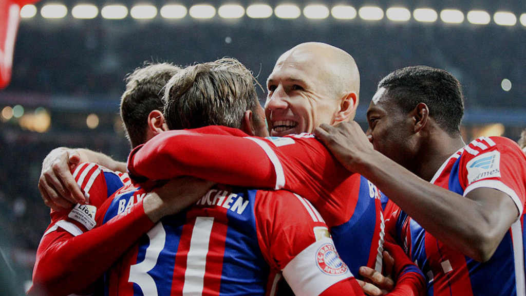 Perhaps inspired by a brilliant crowd choreography to mark the 115th anniversary, the home side roared off the blocks and had the lead just three minutes after referee Daniel Siebert whistled play underway: Robben swung over what was already his side’s fourth corner and Schweinsteiger made light of Kevin Wimmer’s challenge to power a header past Köln keeper Timo Horn.