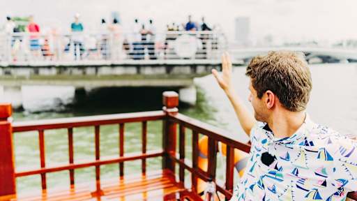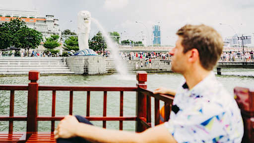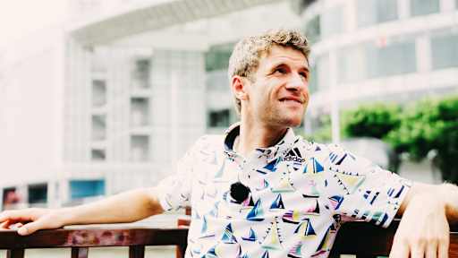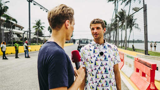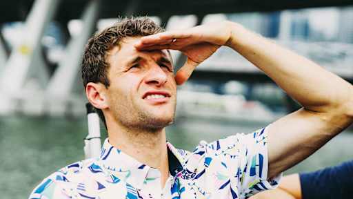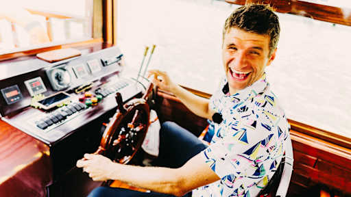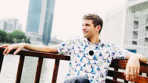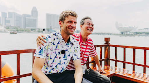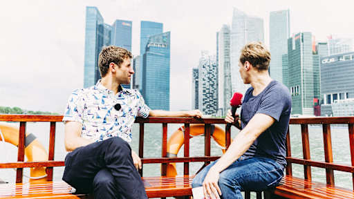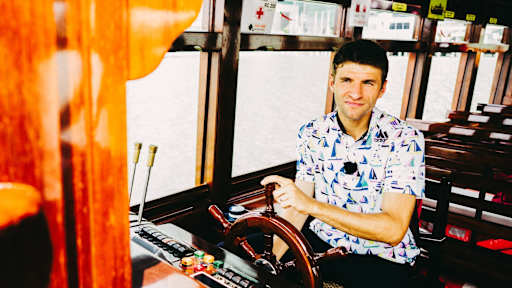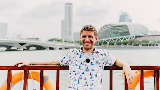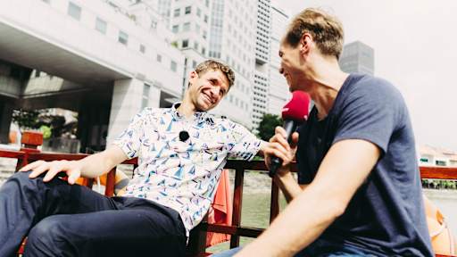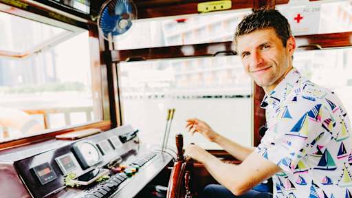 Images of Thomas Müller demonstrating a secret talent as a boat captain in Singapore.