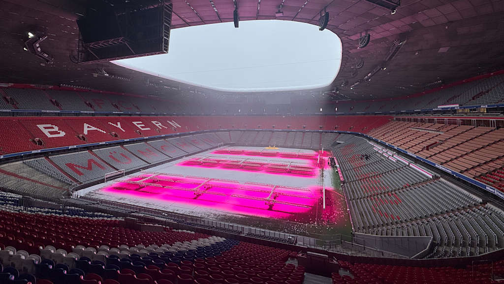 © FC BayernModo invierno en el Allianz Arena: fuera cae una densa nevada, mientras que dentro las luces rosas del césped se encargan de que el verde se mantenga en buen estado incluso con el hielo y el frío. Nuestra sala de estar se está preparando para el próximo partido en casa el sábado (15:30 CET) contra el Eintracht Frankfurt.