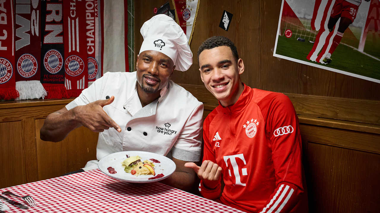 FC Bayern basketballer Serge Ibaka welcomes Jamal Musiala on his "How hungry are you?" series to talk family, the Champions League and eating habits, while preparing Musiala's favourite meal. You can see the full episode on Ibaka's YouTube channel.
