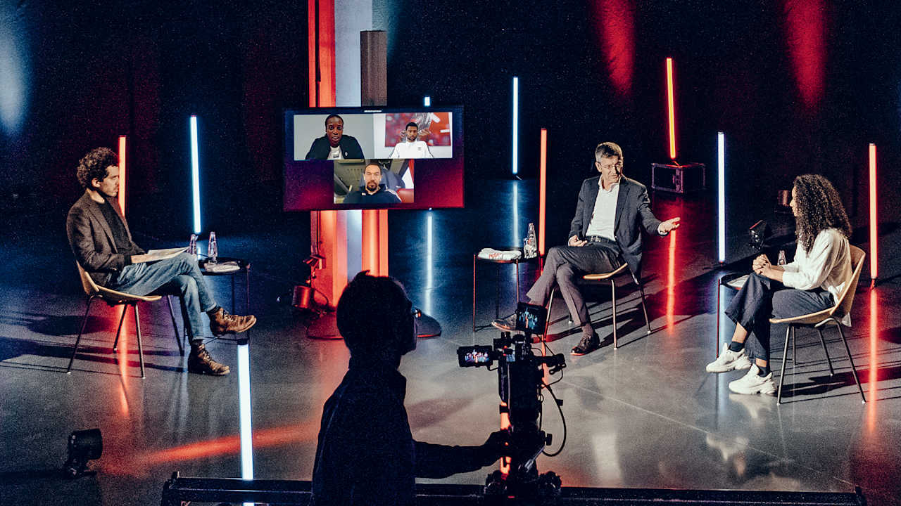 En un diálogo abierto, Herbert Hainer habló con Jennifer Danquah, Sascha Chaimowicz, Viviane Asseyi, Serge Gnabry y Demond Greene.