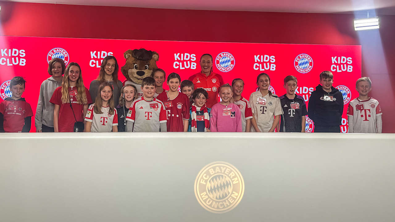 Sydney Lohmann responde a las preguntas de los jóvenes del KIDS CLUB del FC Bayern en una rueda de prensa.
