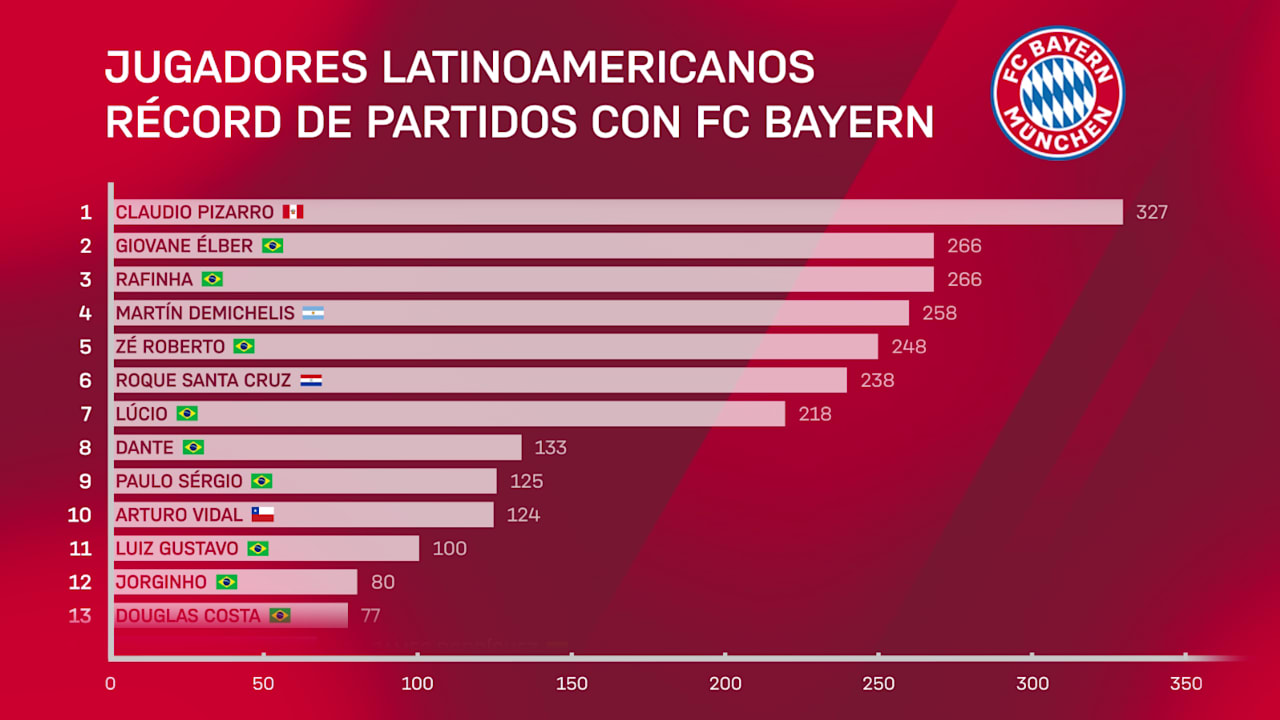 Un listado de todos los jugadores latinoamericanos que han participado en partidos oficiales para el Bayern.