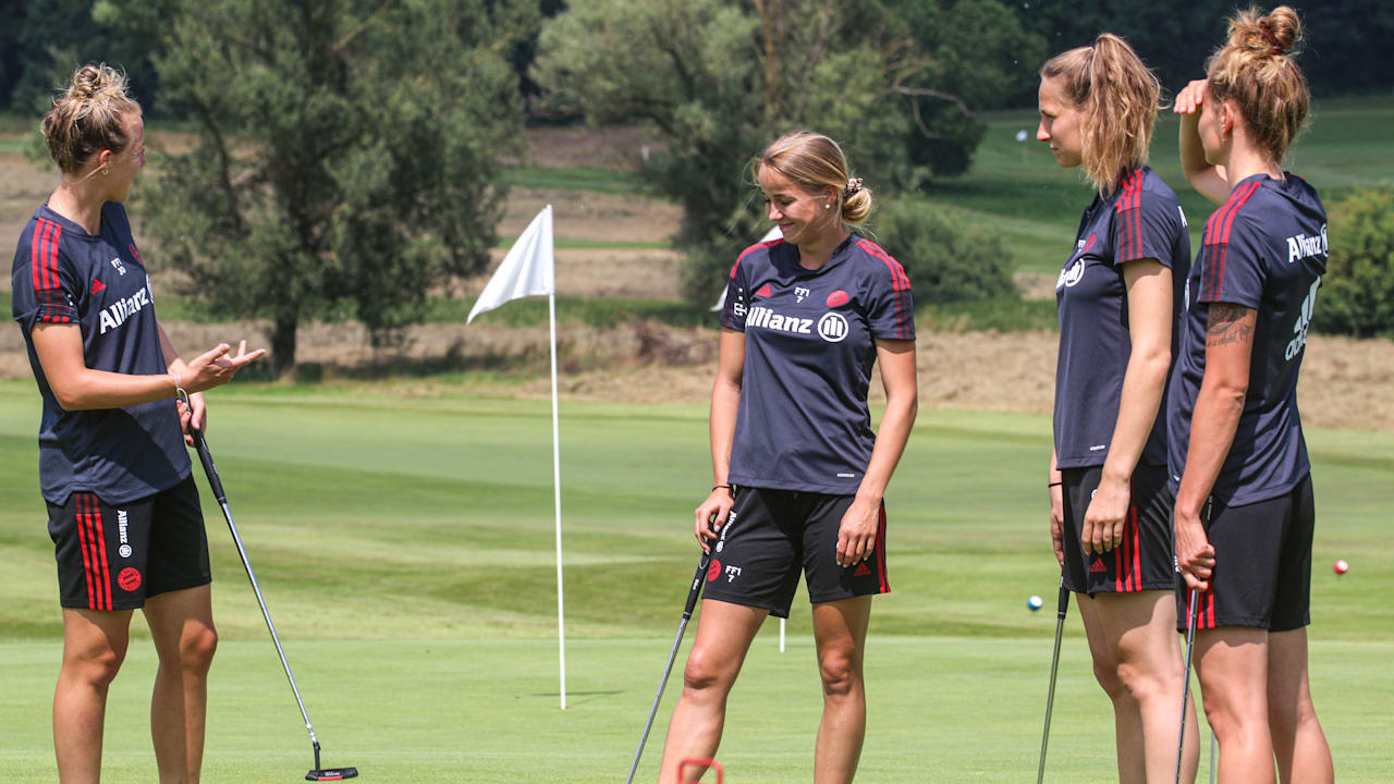 Mit dem Großteil des Kaders und Staffs der FCB-Frauen machte sich das Team von Cheftrainer Jens Scheuer vom FC Bayern Campus auf den Weg ins 30 Kilometer entfernte Rottbach. Bei besten äußeren Bedingungen war die Vorfreude auf ein bisschen Abwechslung in den intensiven Trainingstagen groß. Auf dem Gelände des Golfplatzes teilten sich die Münchnerinnen in drei Gruppen auf und bespielten unterschiedliche Stationen. Neben langen und kurzen Abschlägen versuchten sich die Deutschen Meisterinnen auch beim Putten und wurden dabei von erfahrenen Golftrainern unterstützt.