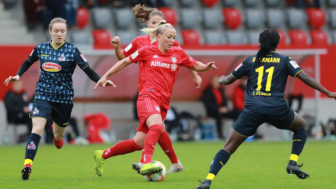 Die Bayern legten los wie vor dem Spiel gefordert: Jovana Damnjanovic traf bereits in der 5. Spielminute mit einem sehenswerten Flachschuss. Nach einem unnötigen Ballverlust im Mittelfeld kamen die Gäste aus Köln nur kurze Zeit später zum überraschenden Ausgleich: Karoline Kohr schloss den Konter der Rheinländerinnen zum 1:1-Ausgleich ab (10.).