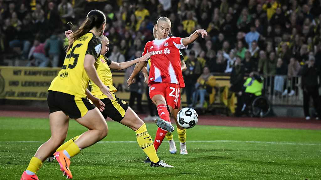 FC Bayern Women are through to the second round of the DFB Cup after a 2-0 win away at Borussia Dortmund in Monday’s first-round tie. Pernille Harder scored both goals in the first half in front of a crowd of 15,755, which included vice-president Walter Mennekes. Bayern will learn their next opponent in their quest to retain the cup this coming Sunday.