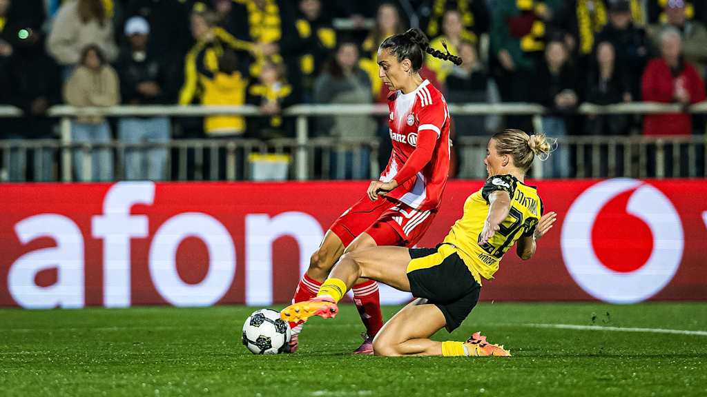 Bayern got off to a good start in the pouring rain at the Stadion Rote Erde and had their first big chance within seconds, but Dortmund goalkeeper Laura van der Laan denied Harder one-on-one and then saved a header from Arianna Caruso not long after. The Munich Frauen continued to dictate play but had to wait until the 27th minute to strike. Van der Laan again produced stops to deny Alara and Caruso’s follow-up but couldn’t do anything to prevent Harder finding a way through at the third attempt. The Dane then doubled the advantage only six minutes later from a tight angle after lovely individual play. Debutant Natalia Padilla-Bidas had an opportunity for a third before the break but struck the outside of the post.