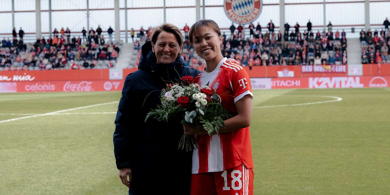 Newly crowned Asian Cup winner Momoko Tanikawa was honoured for her achievement by FC Bayern Women director Bianca Rech ahead of the team’s Bundesliga game at home to Nürnberg on Saturday. The Bayern midfielder was part of the Japan squad that beat hosts Australia 1-0 in Sydney in last week’s final to claim the country’s third continental title and Tanikawa’s first at international level. The 20-year-old scored two goals and provided two assists as she played in four of the six games at the tournament. Congrats again, Momoko!