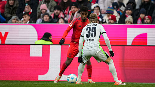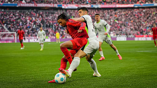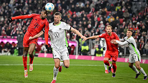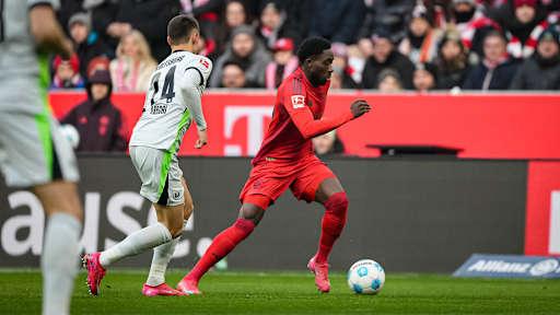 © FC Bayern - Zeige in voller Größe Konrad Laimer im Zweikampf mit einem Wolfsburger Gegenspieler