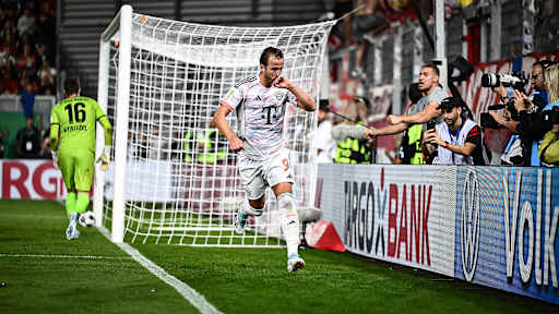 © Imago - Zeige in voller Größe Harry Kane bejubelt zusammen mit seinen Mitspielern den Führungstreffer während des DFB-Pokalspiels des FC Bayern beim SV Wehen Wiesbaden