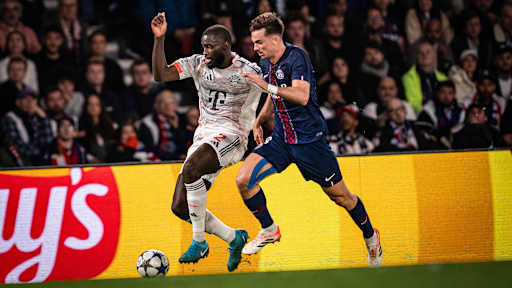 © FC Bayern - Zeige in voller Größe Michael Olise im Kopfballduell im Champions League-Spiel des FC Bayern bei Paris Saint-Germain