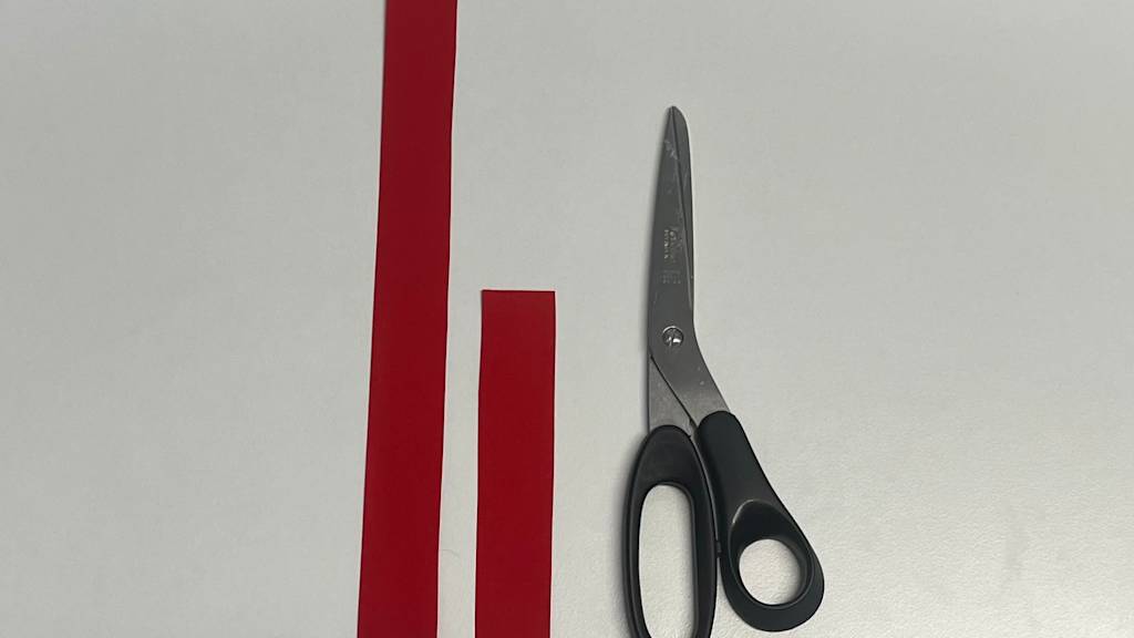 Schneide zwei Streifen aus dem Buntpapier. Sie sollten gleich breit sein, aber der eine Streifen sollte etwa halb so lang wie der andere sein, zum Beispiel 14 x 3 cm und 28 x 3 cm.