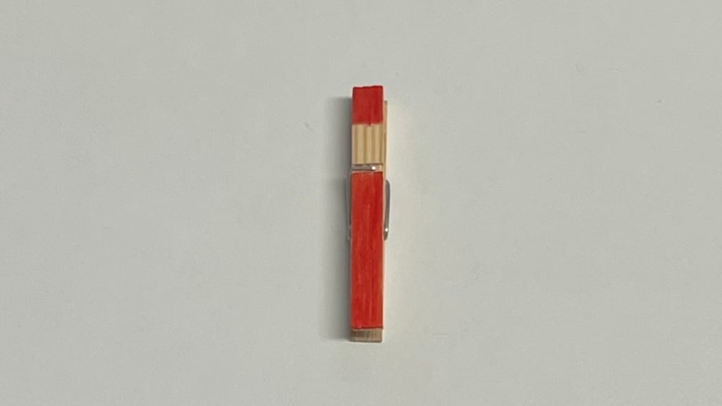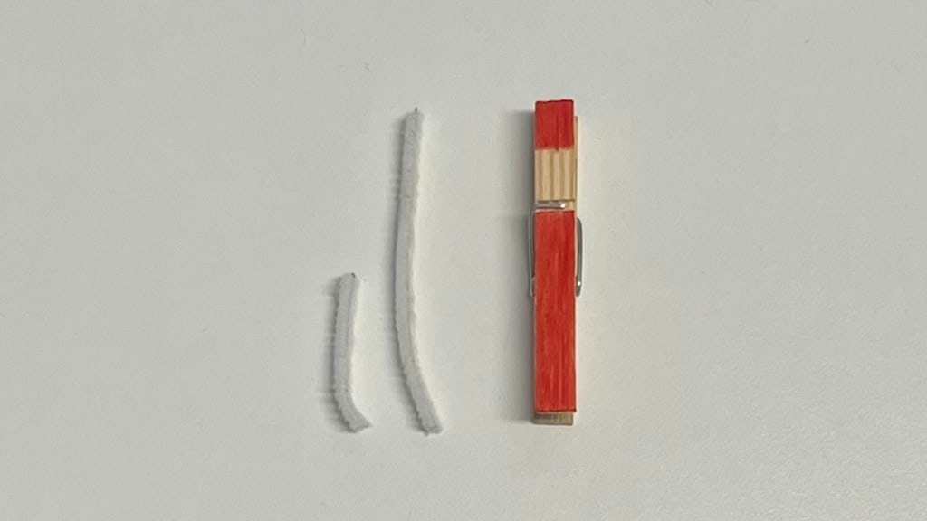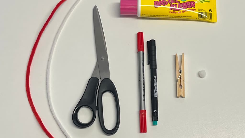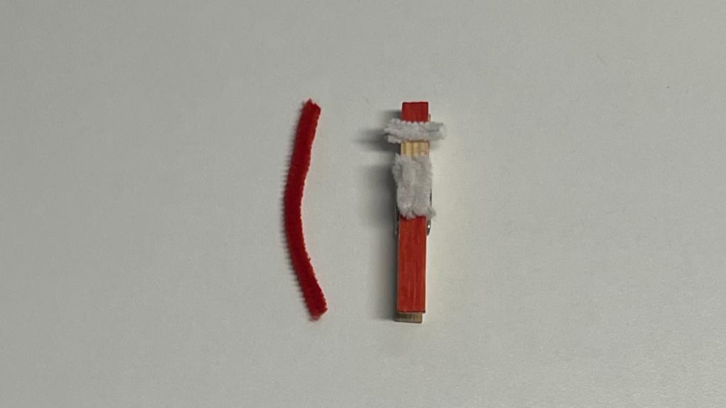 Für die Mütze brauchst du einen roten Pfeifenputzer. Schneide ihn auf die Länge der Klammer zu. Jetzt kommt ein kleiner Trick: Entferne an den Enden jeweils etwa 1 cm der roten Fasern, sodass der Draht sichtbar wird. Das hilft später beim Befestigen und sorgt dafür, dass die Mütze richtig sitzt.