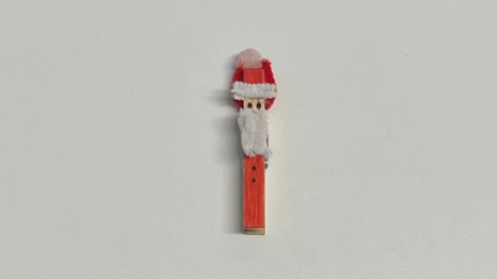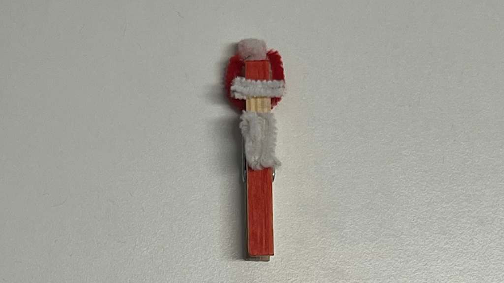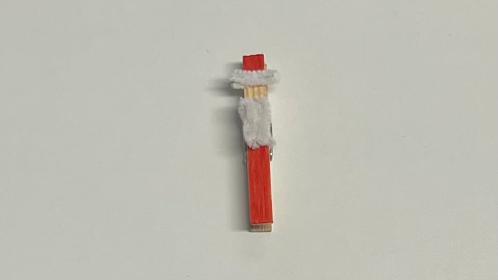 Jetzt kommt der flauschige Teil! Schnapp dir einen weißen Pfeifenputzer und teile ihn in zwei Stücke: Ein längeres Stück, das so lang ist wie die Wäscheklammer – das wird der Bart. Das kürzere Stück sollte etwa halb so lang sein – das wird der Pelzrand der Mütze. So bekommt dein Weihnachtsmann seinen typischen Look!