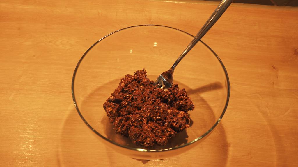Dann gibst du die gemahlenen Mandeln, Haferflocken, das Kakaopulver und den Zimt dazu. Jetzt alles gründlich verkneten, bis eine glatte Masse entsteht.