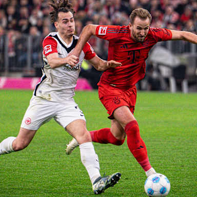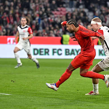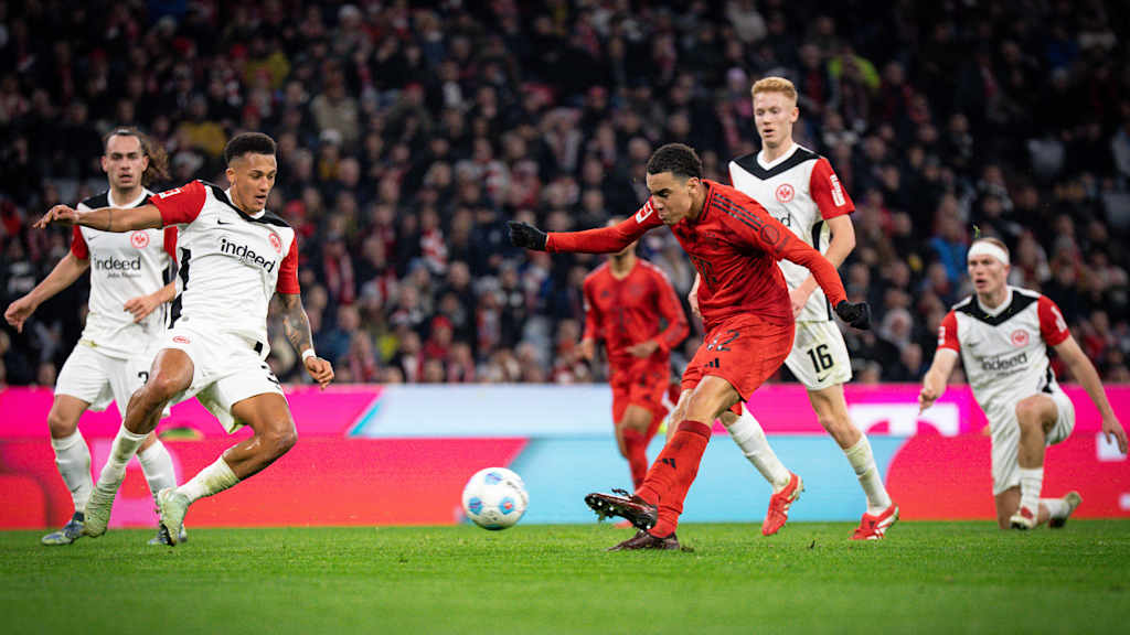 Die Gäste starten mutig und sind die ersten Minuten im Ballbesitz. Bereits in der siebten Minute wird es knapp, als ein Frankfurter Spieler den Ball nur Zentimeter neben dem Tor platziert – das ist gerade nochmal gut gegangen! Doch dann sind unsere Bayern am Zug: Michael Olise leitet die Chance ein, spielt auf Hiroki Ito, der Thomas Müller am Elfmeterpunkt sucht und findet – leider wird der Schuss geblockt. Auch der Nachschuss landet nicht im Netz.