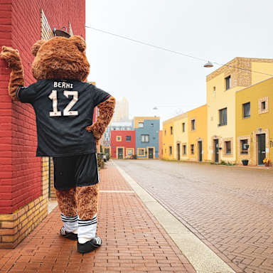 Was bei mir auf keiner Champions League-Reise fehlen darf ist mein Plüsch-Berni – mein kleiner Glücksbringer! Gemeinsam mit meinem Mini-Berni habe ich meine Entdeckungstour im bunten Viertel Woensel West gestartet. Offiziell heißt es Groenewoud. Früher war es ein Arbeiterviertel, aber heute ist es ein richtig cooler Stadtteil, in dem verschiedene Kulturen, kreative Ideen und bunte Architektur zusammenkommen. Die fröhlichen Farben und die schönen Wandmalereien an den Gebäuden machen das Viertel richtig modern und lebendig!