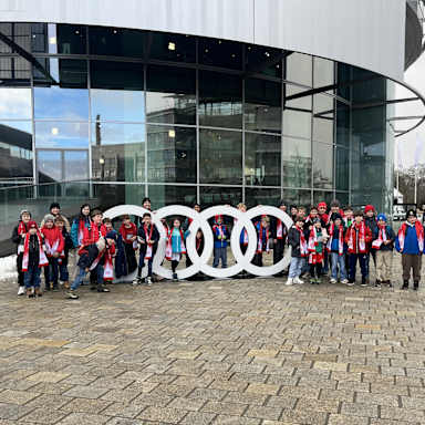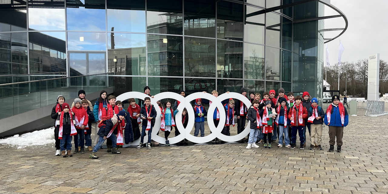 Am Montag, den 16. Februar 2026, waren einige meiner KIDS CLUB-Freunde und ich zu Gast bei Audi in Ingolstadt. Schon der Start unserer Reise war ein echtes Highlight: An der Säbener Straße sind wir mit einem Teil der Gruppe im FC Bayern-Bus in Richtung unseres Ausflugziels gestartet. In Ingolstadt haben wir dann die restlichen Teilnehmer getroffen. Und dann ging das Abenteuer richtig los: Zusammen mit über 30 KIDS CLUB-Mitgliedern durften wir die größte Produktionsstätte unseres Automobilpartners erkunden und bekamen super spannende Einblicke in die Welt der Autoproduktion.