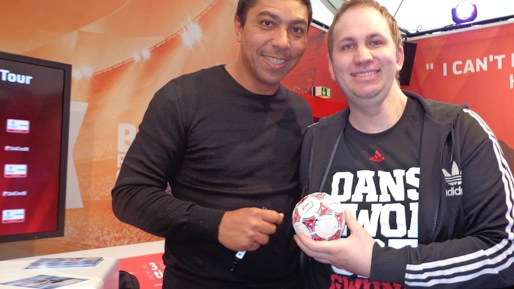Vor die Linse bekam Stickl seinen Lieblings-Spieler in seiner aktiven Zeit leider nie. Aber er gab auch in den Jahren danach nicht auf - und am 21. September des vergangenen Jahres war es dann so weit. Auf der UEFA Champions League Trophy Tour in Berlin er ich Giovane Elber persönlich. Der Brasilianer nahm sich sehr viel Zeit, sowohl mitgebrachten Poster und Autogrammkarten als auch den Mini-Ball, den Stickl dabei hatt, zu signieren. Und als Schmankerl gab es dieses einmalige Foto - nun zu sehen in der FC Bayern Erlebniswelt.
