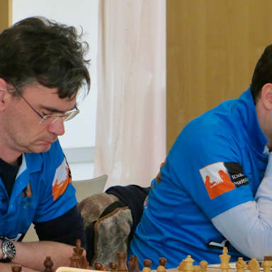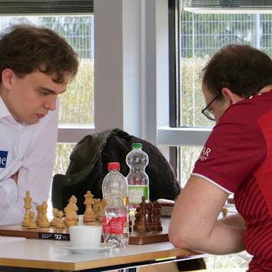 Dass sich die Mannschaft in den roten Trikots aber auch gegen derartige Gegner nicht zu verstecken braucht, wurde gestern gegen den SC Viernheim breite deutlich, selbst wenn das Ergebnis am Ende recht klar ausfiehl. Auch heute gegen die SG Solingen suchte die Mannschaft ihre Chance und legte die Partien entsprechend an. Und die Chancen ergaben sich tatsächlich. Eine davon nutzte schließlich Makan Rafiee an Brett 8, der sein Team in Führung brachte. Diese Führung hielt sehr lange und hätte vielleicht hier und da noch ausgebaut werden können, aber die "Blauen" hielten dagagen und kamen ganz am Ende noch zum Ausgleich. Und das ausgerechnet in eier Partie, die zwischenzeitlich sehr vereißungsvoll aussah und dann unmittelbar vor der Zeitkontrolle kippte.
